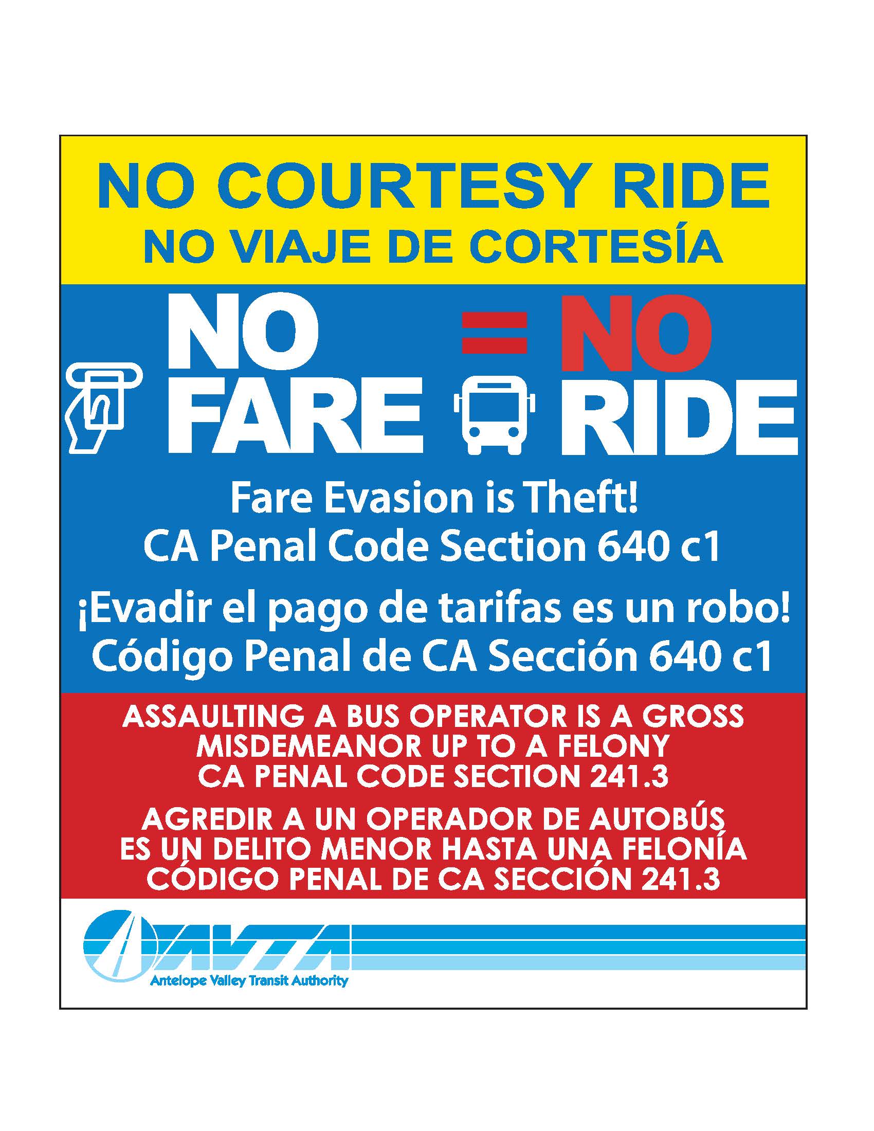 New signage has been installed on AVTA vehicles reminding riders that there is no such thing as a “Courtesy Ride” and fare evasion is a violation of California Penal Code Section 640 c1. Violators can be identified by law enforcement using the bus camera system, mobile TAP Card validators to check for activity, and even undercover law enforcement officers. Fines of up to $250 may result from successful prosecution for fare evasion violations.